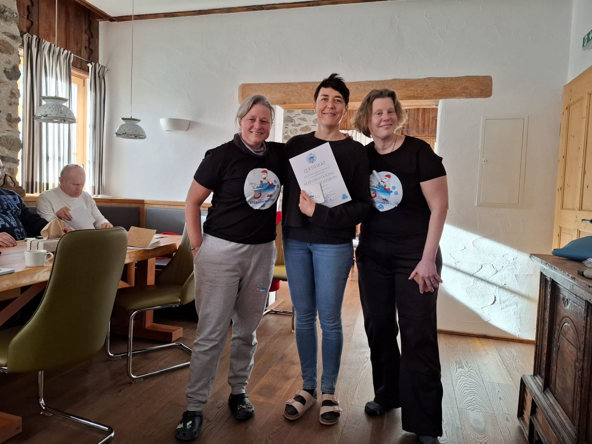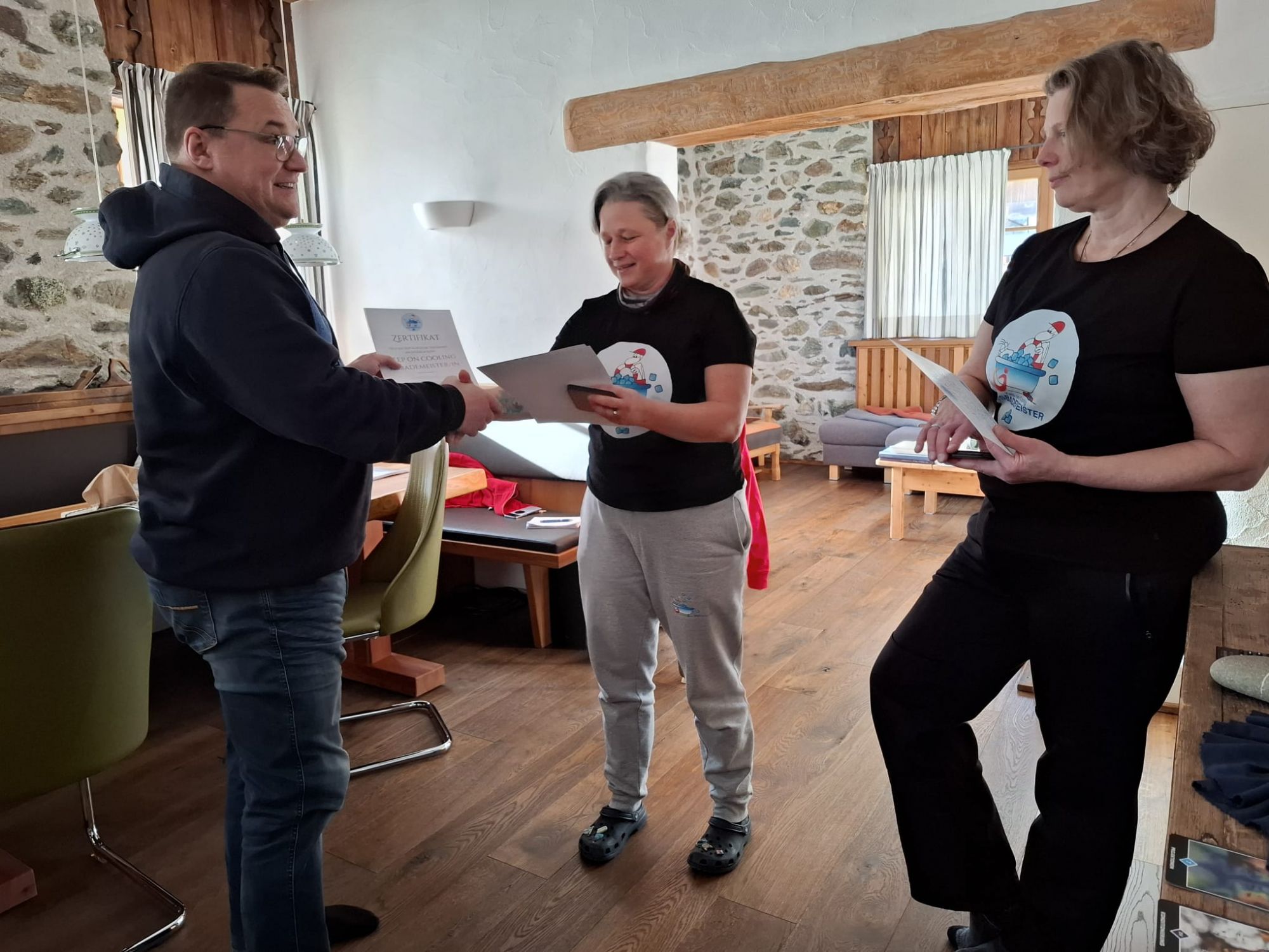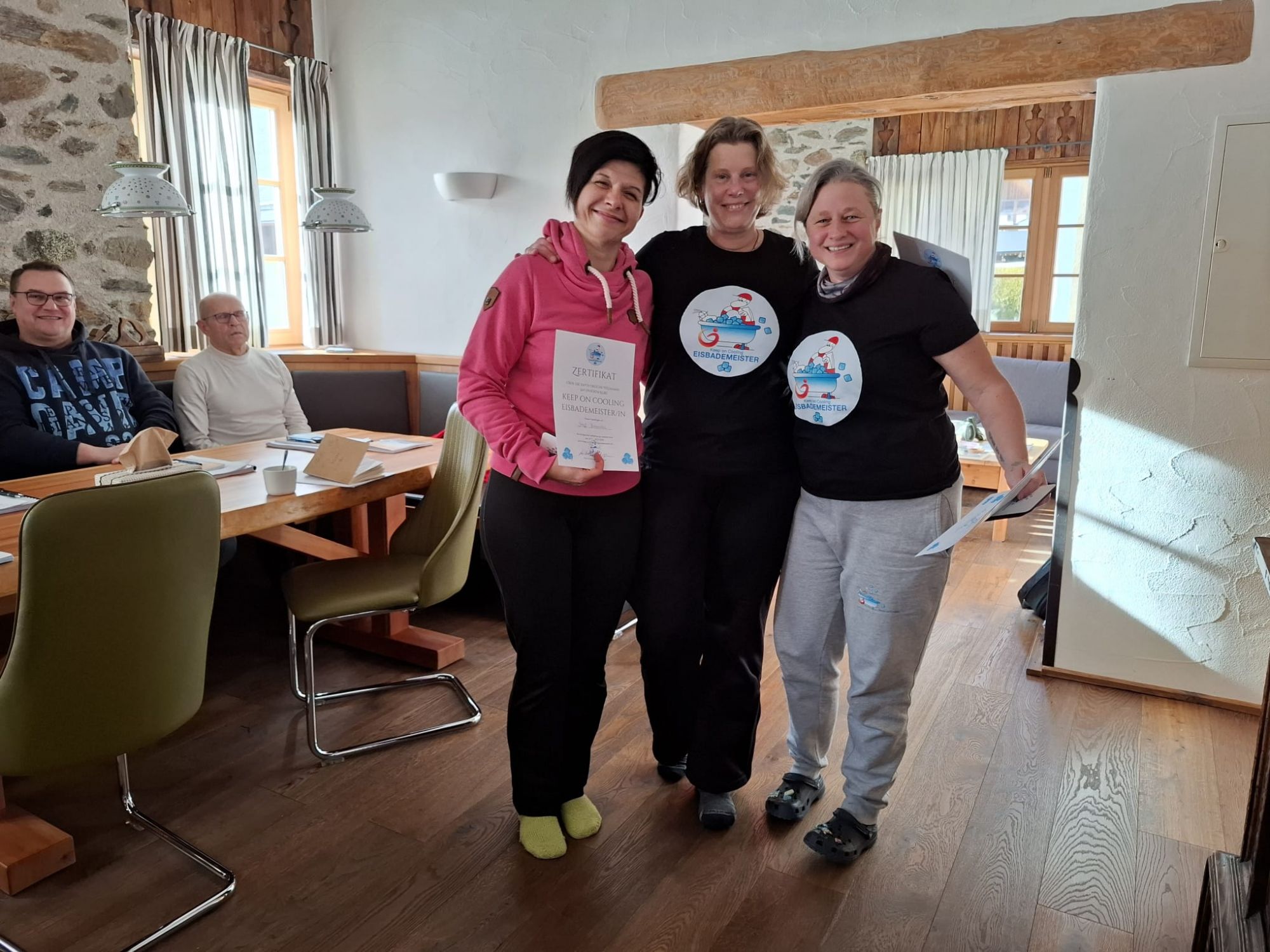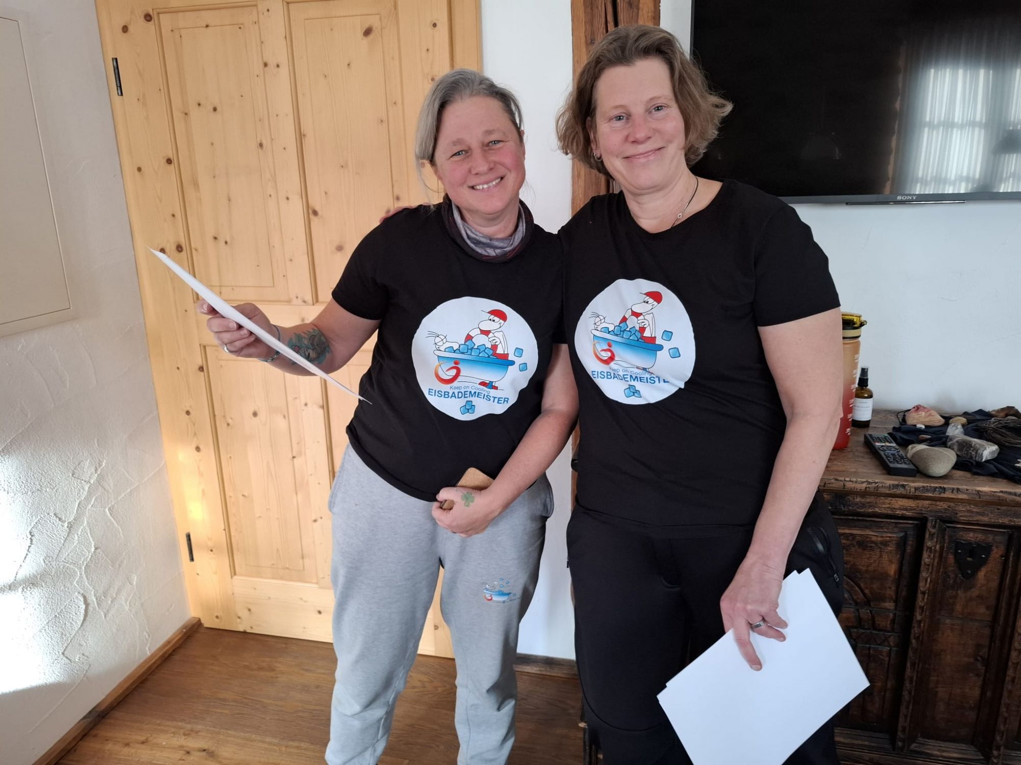 Sonja Flandorfer, auch bekannt als die Coolste Frau Österreichs, und Martina Hädge bilden erfahrene Kaltwasser-Fans zu „Eisbademeister“ aus.