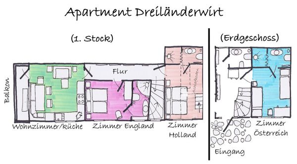 Es gibt 2 Schlafzimmer, jedes mit eigenem Badezimmer und Toilette und dann noch dazu eine geräumige Küche/Wohnzimmer mit Balkon. Der Name ‘Dreiländerwirt’ wird reflektiert in die Einrichtung von dem Appartement. Die 2 Schlafzimmer haben ihren eigenen Stil.