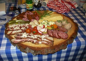 Fast alles ist hausgemacht, vieles aus unsere eigenen Gemüsegarten und es wird auf einem Holz Herd gekocht.
