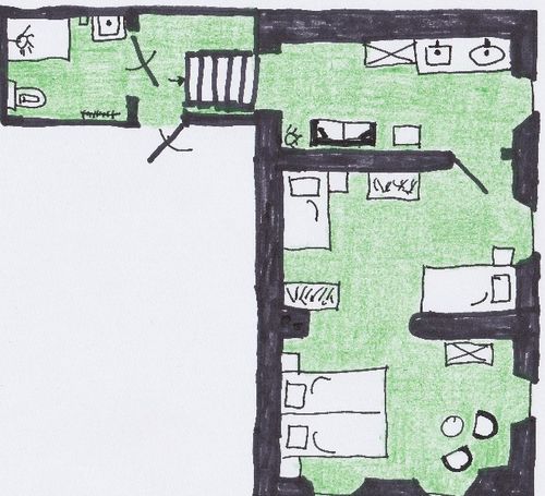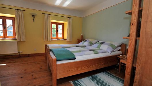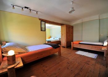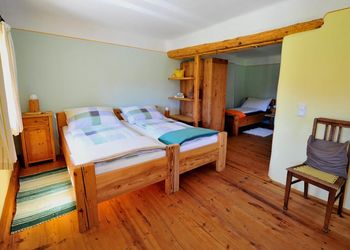 Sehr geräumiges Vierbettzimmer mit 4 aus Altholz gemachten Betten. Das helle, im Bauernstil eingerichtete Zimmer hat am Flur eine Waschgelegenheit und im gleichen Stock ein Badezimmer mit Dusche, Waschbecken und WC, der ausschließlich für die Gäste diesen Zimmer zur Verfügung steht.