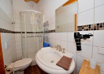 - Badezimmer mit Duschkabine, Waschbecken, WC, Föhn